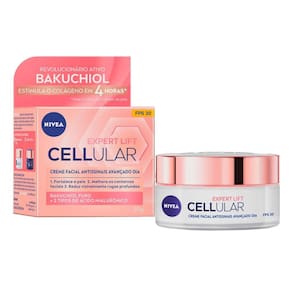 O Creme Hidratante Facial Nivea Antissinais Cellular Lift Expert Dia atua nos níveis celulares mais profundos da pele para revelar uma pele com aparência mais jovem. Possui uma poderosa combinação de ativos anti-idade com bakuchiol puro, ativo revolucionário estimula a produção de colágeno e ajuda a redensificar e fortalecer as fibras de sustentação da pele. Além disso, possui 2 tipos de ácido hialurônico que hidrata e suaviza a pele, reduzindo visivelmente as rugas profundas. Conta ainda com proteção solar FPS 30.