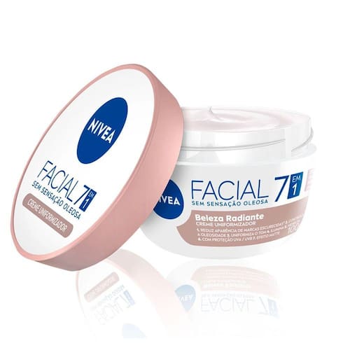 O Creme Hidratante Facial Nivea Pele Negra foi especialmente desenvolvido para as necessidades da pele negra. Possui ação 7 em 1 que e fórmula enriquecida com ácido hialurônico, extrato de pérolas e cúruma. Juntos esses ativos reduz a aparência de manchas escurecidas, controla a oleosidade e uniformiza o tom da pele. Além disso, hidrata profundamente a pele, ilumina e possui proteção UVA e UVB.