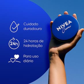 O NIVEA Creme Hidratante Lata é um creme clássico que proporciona hidratação profunda por até 24 horas. Reconhecido mundialmente, ele se destaca por seu cuidado completo e versátil contra a pele ressecada.