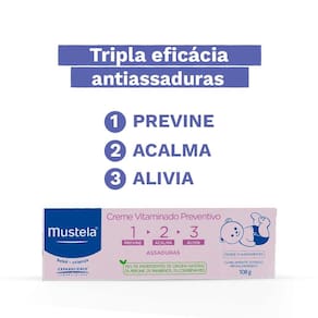 Mustela Creme Vitaminado Preventivo de Assaduras Tripla Ação 110g O Creme Vitaminado Preventivo de Assaduras 123 Mustela é o cuidado completo para proteger a pele do bebê das assaduras a cada troca