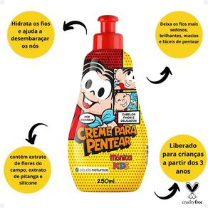 O Creme para Pentear Cabelos Finos e Delicados Mônica Kids contém extrato de flores do campo, extrato de pitanga e silicone, que deixam os fios mais sedosos, brilhantes, macios e fáceis de pentear.O creme hidrata os fios e ajuda a desembaraçar os nós, além de deixar o cabelo com um delicioso cheirinho. Não irrita os olhos. Liberado para crianças a partir de 03 anos.