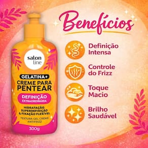 Apresentamos o Creme Para Pentear Salon Line Gelatina + Definição Extraordinária 300g, a solução definitiva para quem busca cachos e ondas impecavelmente definidos e cheios de vida. Desenvolvido pela renomada SALON LINE, este creme para pentear não apenas modela seus cabelos, mas também nutre e protege, garantindo uma definição extraordinária que dura o dia todo. Ideal para quem deseja exibir fios saudáveis, com volume controlado e um brilho radiante, este produto é a chave para transformar seus cabelos em uma obra de arte. Perfeito para quem busca praticidade e resultados profissionais no cuidado diário dos cabelos cacheados e ondulados.