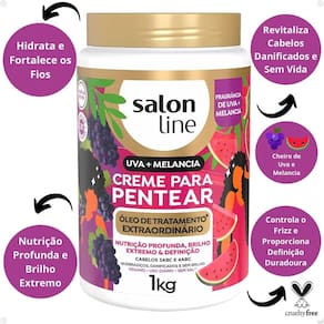 O Creme Para Pentear Salon Line Óleo de Tratamento Extraordinário Uva + Melancia 1kg é ideal para cabelos ondulados, cacheados e crespos que precisam de nutrição profunda e brilho extremo. Sua fórmula contém ativos poderosos como óleo de uva e melancia, que hidratam e fortalecem os fios, além de controlar o frizz e proporcionar definição duradoura.