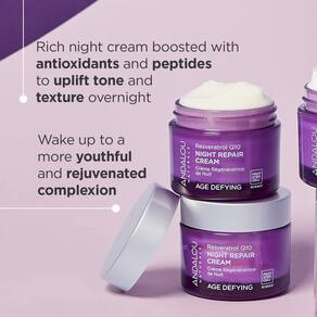 - Pele mais macia, suave e sem idade. Para pele seca, pele opaca, pele descamada e pele prematuramente envelhecida. O creme reparador noturno Resveratrol Q10 da Andalou Naturals usa ingredientes inspirados pela natureza para ajudar a manter a saúde da pele para uma pele uniforme, mais suave e jovem.