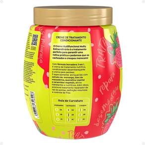 Creme 3 em 1 Multy Extraordinário Morango e Óleo de MacadâmiaO Creme de Tratamento 3 em 1 intenso, é super condicionador e creme para pentear. Ele proporciona tratamento nutritivo reparador intensivo da raiz às pontas e definição com efeito volumoso. Além de sedosidade e ação antifrizz. Ideal para cabelos cacheados e crespos desidratados e sem volume. Para + de 12 anos. Fragrância frutal. Não testado em animais. Vegano..Principais AtivosExtrato de morango: aliado da hidratação dos cabelos, proporciona fios macios e brilhosos.Óleo de macadâmia: proporciona brilho intenso e maciez.Queratina vegetal: restaura e hidrata, auxiliando na reconstrução dos fios.Ceramidas vegetais: Fortalece e protege os fios, retendo a hidratação e promovendo um cabelo mais saudável e resistente..Modo de UsoCreme de tratamento: Com os cabelos limpos e úmidos, aplique o produto mecha a mecha, enluvando os fios da raiz até as pontas. Deixe agir por 5 minutos e enxágue bem.Condicionador: Com os cabelos limpos e úmidos, aplique o produto massageando os fios do comprimento até as pontas. Enxágue bem.Creme para pentear: Com os cabelos limpos e úmidos, aplique o produto mecha a mecha, uniformemente, no comprimento e nas pontas. Desembarace os fios com um pente de dentes largos e amasse-os iniciando movimento das pontas até à raiz. A aplicação ideal dependerá da quantidade e do comprimento dos fios. NÃO ENXÁGUE.