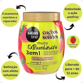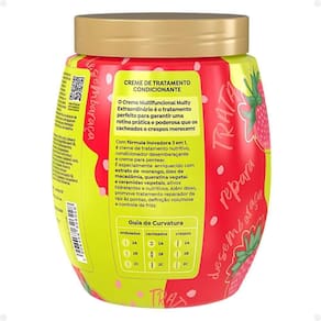 Creme 3 em 1 Multy Extraordinário Morango e Óleo de MacadâmiaO Creme de Tratamento 3 em 1 intenso, é super condicionador e creme para pentear. Ele proporciona tratamento nutritivo reparador intensivo da raiz às pontas e definição com efeito volumoso. Além de sedosidade e ação antifrizz. Ideal para cabelos cacheados e crespos desidratados e sem volume. Para + de 12 anos. Fragrância frutal. Não testado em animais. Vegano..Principais AtivosExtrato de morango: aliado da hidratação dos cabelos, proporciona fios macios e brilhosos.Óleo de macadâmia: proporciona brilho intenso e maciez.Queratina vegetal: restaura e hidrata, auxiliando na reconstrução dos fios.Ceramidas vegetais: Fortalece e protege os fios, retendo a hidratação e promovendo um cabelo mais saudável e resistente..Modo de UsoCreme de tratamento: Com os cabelos limpos e úmidos, aplique o produto mecha a mecha, enluvando os fios da raiz até as pontas. Deixe agir por 5 minutos e enxágue bem.Condicionador: Com os cabelos limpos e úmidos, aplique o produto massageando os fios do comprimento até as pontas. Enxágue bem.Creme para pentear: Com os cabelos limpos e úmidos, aplique o produto mecha a mecha, uniformemente, no comprimento e nas pontas. Desembarace os fios com um pente de dentes largos e amasse-os iniciando movimento das pontas até à raiz. A aplicação ideal dependerá da quantidade e do comprimento dos fios. NÃO ENXÁGUE. Ean: 7908458326228