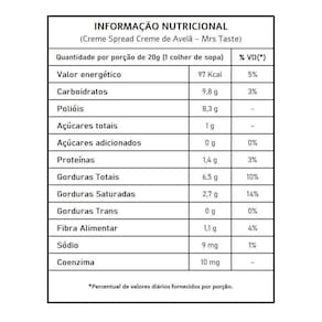 Descrição: Os novos cremes da mrs taste estão prestes a chegar para revolucionar o seu paladar Sua formulação conta com whey protein, coenzima q10 e zero adição de açúcar. Esses spreads são a combinação perfeita de sabor e saúde. Prepare-se para se deliciar com essas novidades que vão transformar suas receitas e momentos de lanche. Ingredientes: Maltitol, gordura vegetal, cacau em pó, leite desnatado em pó, proteína concentrada do soro de leite, coenzima q10, aromatizantes, emulsificantes lecitina de soja e polirricinoleato de poliglicerol e edulcorante stevia. Não contém glúten. Alérgicos: contém derivados de leite e soja. Pode conter avelã, amendoim e pistache. Sugestão de consumo: Consumir uma porção 20g ao dia, ou conforme orientação . Conservação: Conservar este produto em local seco e fresco. Em altas temperaturas pode haver a presença natural de oleosidade na superfície - misture bem para voltar à cremosidade ideal. Marca: Não Informado