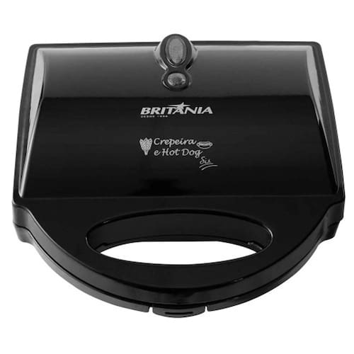 Crepeira Britânia SIX com capacidade para 6 crepes, chapas antiaderentes, rebaixo para palitos, luzes indicadoras de funcionamento e aquecimento, base antiderrapante e trava na tampa.Porta-fio