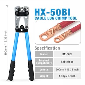 Ferramenta de crimpagem de cabo de bateria iCrimp - ?Design ergonômico? Alça revestida de borracha antiderrapante para um trabalho de trabalho mais confortável e econômico. - ?Matrizes de crimpagem giratórias? A ferramenta tem 6 moldes de 8, 6, 4, 2, 1, 1/0 AWG, usando cabeças rotativas com um pino de travamento acionado por mola para manter as cabeças. - ?Durável? O crimpador é feito de aço temperado SCM-40 para um uso durável e de longa vida útil. Nós especialmente engrossamos e reforçamos a placa de metal na cabeça de crimpagem. - ?Fácil operação? Pressione o parafuso e gire as matrizes para o tamanho que você precisa, então basta puxar fortemente o crimpador de terminal de fio catraca e produzir uma boa crimpagem nos terminais do cabo. - ?Design de mandíbula de alta precisão? O crimpador com mandíbula de alta precisão garante uma conexão firme após a crimpagem com forte pressão de trabalho. Esta ferramenta tem ampla aplicação em trabalhos eletrônicos automáticos.