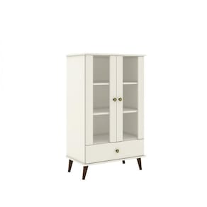 Cristaleira baixa retrô, 2 portas de vidro 4mm temperado, 1 gaveta com corrediça metálica, 3 prateleiras internas, pés arredondados de madeira maçiça, produzido em MDP 15mm, acabamento pintura impressão UV. Acabamento da Gaveta: Pintura UV Acabamento da Porta: Pintura UV Acabamento da Prateleira: Pintura UV Altura dos Pés: 14 cm Ambiente Principal: Sala de Jantar Complexidade da Montagem: Baixa: pode ser montado por uma pessoa sozinha Cor: Off White Cor do Produto: Off white Cor Interna: Off white Escala de Brilho: Fosco Escala de Brilho da Porta: Fosco Escala de Brilho da Prateleira: Fosco Gaveta com Chave: Não Itens Inclusos: 1 Cristaleira, Kit Ferragens e Manual de Montagem Manual de Especificação Técnica: https://cdn2.madeiramadeira.com.br/atributo/movelbento/893682-rt-3107.pdf Manual de Montagem e Instalação: https://cdn2.madeiramadeira.com.br/atributo/movelbento/893684-rt-3107.pdf Material da Gaveta: MDP Material da Porta: Vidro Material da Prateleira: MDP Material Principal: MDP Necessita Montagem: Sim Origem do Produto: Nacional Peso: 32 kg Peso Máximo por Gaveta: 3 kg Peso Máximo por Prateleira: 5 kg Possui Adega: Não Possui Espelho: Não Possui Gavetas: 01 Possui iluminação: Não Possui Nicho: Não Possui Pés: 04 Possui Portas: 02 Possui Prateleiras: 02 Possui Rodízio: Não Recomendações de Uso, Manutenção e Limpeza: Limpeza: utilize um pano levemente umedecido, seguido de pano seco. Não utilizar produtos químicos ou abrasivos, pois pode danificar o acabamento do móvel. Sapatas Niveladoras: Não Sistema de Montagem: Parafuso, cavilha e minifix Suporta Até (kg): 35 kg Tamanho: Tipo de Corrediça da Gaveta: Metálica Simples Tipo de Dobradiça/Corrediça da Porta: Metálica Tipo de Porta: Bater Tipo de Puxador da Gaveta: Externo Tipo de Puxador da Porta: Externo