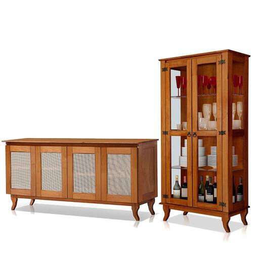 • Acabamento: Cristaleira: Base em Madeira Maciça; Buffet: Feito de Madeira Pinus Taeda Reflorestada com Componentes Internos em MDF