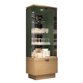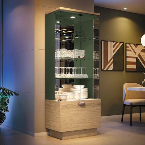 Design moderno e sofisticado. Possui portas de vidro com sistema de fecho magnético proporcionando facilidade e segurança. Laterais de vidro fixadas com suportes cromados. 02 Prateleiras de vidro e outra em MDF. Espelhos ao fundo e Luminária LED, valorizando ainda mais as louças, taças e decorações. Gavetão com corrediças telescópicas e Nicho Adega embutido com espaço para 6 garrafas.