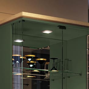 Características Produzido em MDP e MDF de 25mm e 15mm Portas de Vidro Prateleiras de Vidro Gavetão Vidros 6mm Espelhos 3mm Luminária LED Corrediça telescópica Acabamento Impressão Uv Nicho para Garrafas
