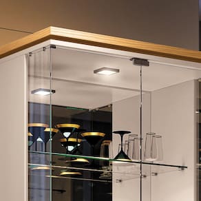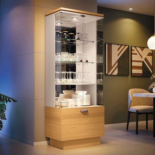 Design moderno e sofisticado. Possui portas de vidro com sistema de fecho magnético proporcionando facilidade e segurança. Laterais de vidro fixadas com suportes cromados. 02 Prateleiras de vidro e outra em MDF. Espelhos ao fundo e Luminária LED, valorizando ainda mais as louças, taças e decorações. Gavetão com corrediças telescópicas e Nicho Adega embutido com espaço para 6 garrafas.