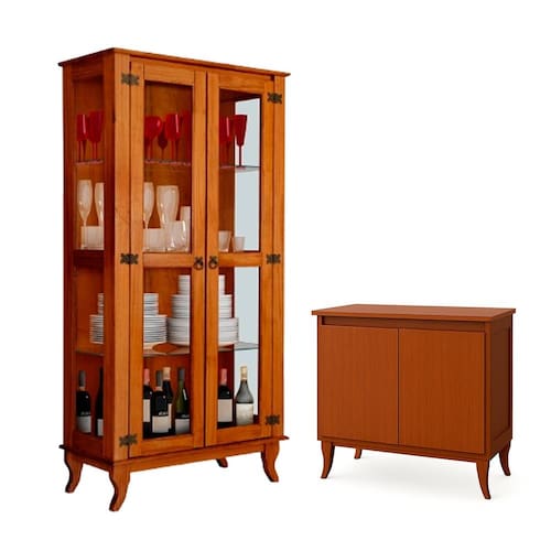 A cristaleira, com portas de vidro e prateleiras amplas, valoriza a decoração e mantém taças e louças sempre organizadas e à vista, enquanto o buffet complementa o conjunto com ótimo espaço interno para guardar utensílios, toalhas e acessórios de jantar. Seu design clássico com acabamento natural realça a beleza dos veios da madeira, combinando facilmente com diversos estilos de ambiente, do rústico ao contemporâneo.