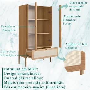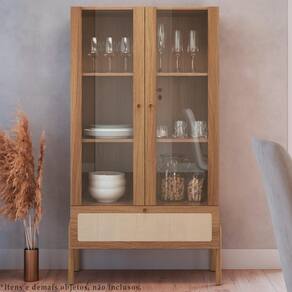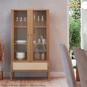 Cristaleira 2 Portas de Vidro 1 Gaveta e Pés em Madeira 27963, clássica, minimalista e funcional, o móvel que irá decorar seu ambiente com elegância e requinte na medida. Estrutura e prateleiras em MDP de 15mm, costas em HDF de 3mm e vidro de 4mm, conta com acabamento BP, gaveta de corrediças telescópicas e aplique de tela sintética, dando ao produto um traço clássico e artesanal. Possui também 02 portas de vidro temperado incolor e dobradiças metálicas. Tanto a gaveta quanto as portas, possuem puxadores de poliestireno na cor dourada, seus pés são de madeira maciça (eucalipto) com acabamento PU e sapatas emborrachadas. O peso suportado por cada prateleira e pela gaveta é respectivamente: 5kg e 3kg, peso máximo suportado: 18kg. Com seus traços suaves e acolhedores, ela irá conferir design e luxo ao seu ambiente. Este móvel chegará na sua casa separado em 02 volumes.