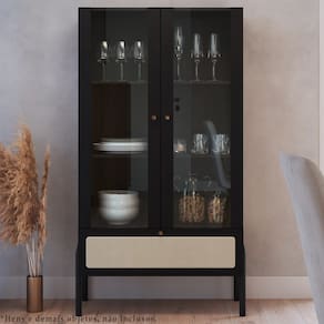 Cristaleira 2 Portas de Vidro 1 Gaveta e Pés em Madeira 27963, clássica, minimalista e funcional, o móvel que irá decorar seu ambiente com elegância e requinte na medida. Estrutura e prateleiras em MDP de 15mm, costas em HDF de 3mm e vidro de 4mm, conta com acabamento BP, gaveta de corrediças telescópicas e aplique de tela sintética, dando ao produto um traço clássico e artesanal. Possui também 02 portas de vidro temperado incolor e dobradiças metálicas. Tanto a gaveta quanto as portas, possuem puxadores de poliestireno na cor dourada, seus pés são de madeira maciça (eucalipto) com acabamento PU e sapatas emborrachadas. O peso suportado por cada prateleira e pela gaveta é respectivamente: 5kg e 3kg, peso máximo suportado: 18kg. Com seus traços suaves e acolhedores, ela irá conferir design e luxo ao seu ambiente. Este móvel chegará na sua casa separado em 02 volumes.