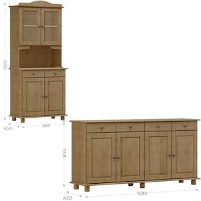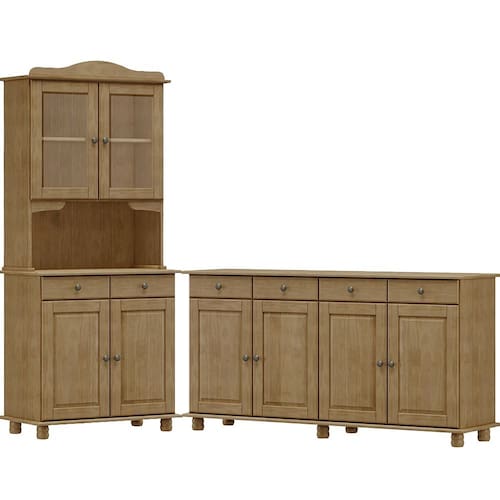 Cristaleira e Balcão, um conjunto projetado para quem busca móveis que combinam elegância e funcionalidade para complementar sua decoração. Produzido em madeira maciça de pinus de reflorestamento, sua estrutura robusta garante durabilidade e resistência. A Cristaleira conta com 04 portas, sendo 02 de vidro incolor, e 02 gavetas, e o Balcão com 04 portas e 04 gavetas. As portas possuem dobradiças com amortecimento, e as gavetas corrediças telescópicas, que proporcionam abertura suave e silenciosa. Com pintura acetinada com verniz PU e UV, que realça a beleza natural da madeira enquanto protege contra desgastes do dia a dia e puxadores metálicos que adicionam um toque moderno ao design clássico do produto. Os pés torneados em madeira maciça garantem estabilidade e charme artesanal. Oferecem amplo espaço interno, perfeitos para organizar louças, objetos decorativos ou itens de sua preferência. Estes móveis chegarão em sua casa separados em 03 volumes.