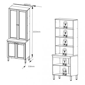 2 Portas com vidro, dobradiças metálicas 35mm com sistema de amortecimento,