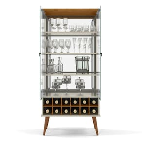 Feito em MDF. Contém 4 prateleiras, adega com 12 nichos para acomodar garrafas, 2 portas de vidro temperado 4mm e espelhos internos.