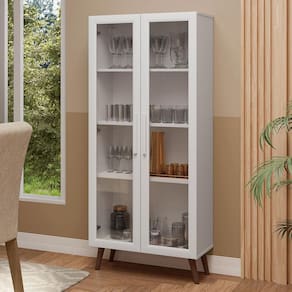 As duas portas de vidro adicionam um toque de sofisticação, permitindo que você organize e visualize suas louças, copos e demais itens decorativos. Com diversas prateleiras, a parte interna oferece um ótimo aproveitamento de espaço, ajudando a manter tudo em ordem.