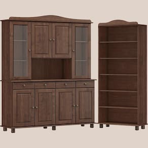 Cristaleira e Estante Livreiro, um conjunto projetado para quem busca móveis que combinam elegância e funcionalidade para complementar sua decoração. Produzido em madeira maciça de pinus de reflorestamento, sua estrutura robusta garante durabilidade e resistência. A Cristaleira de 168,9cm de largura, conta com 08 portas sendo 02 de vidro incolor, que possuem dobradiças com amortecimento. As gavetas com corrediças telescópicas proporcionam abertura suave e máxima praticidade para guardar itens menores, enquanto os puxadores metálicos adicionam um toque moderno ao design clássico do produto. Com amplo espaço para organização, a Estante de 85cm de largura é perfeita para acomodar livros, objetos decorativos ou itens de sua preferência. Ambos os móveis possuem pintura acetinada com verniz PU e UV, que realça a beleza natural da madeira enquanto protege contra desgastes do dia a dia, e pés torneados em madeira maciça que garantem estabilidade e charme artesanal. Estes móveis chegarão em sua casa separados em 04 volumes.