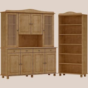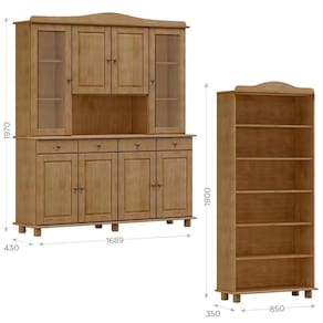 Cristaleira e Estante Livreiro, um conjunto projetado para quem busca móveis que combinam elegância e funcionalidade para complementar sua decoração. Produzido em madeira maciça de pinus de reflorestamento, sua estrutura robusta garante durabilidade e resistência. A Cristaleira de 168,9cm de largura, conta com 08 portas sendo 02 de vidro incolor, que possuem dobradiças com amortecimento. As gavetas com corrediças telescópicas proporcionam abertura suave e máxima praticidade para guardar itens menores, enquanto os puxadores metálicos adicionam um toque moderno ao design clássico do produto. Com amplo espaço para organização, a Estante de 85cm de largura é perfeita para acomodar livros, objetos decorativos ou itens de sua preferência. Ambos os móveis possuem pintura acetinada com verniz PU e UV, que realça a beleza natural da madeira enquanto protege contra desgastes do dia a dia, e pés torneados em madeira maciça que garantem estabilidade e charme artesanal. Estes móveis chegarão em sua casa separados em 04 volumes.