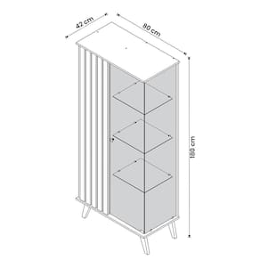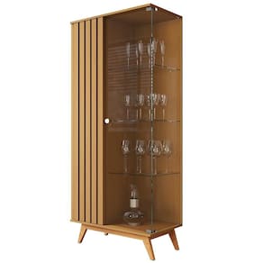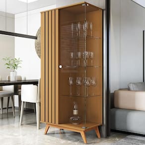 Material da estrutura: lateral e porta ripados em MDP e MDF de 24 mm; tampo, base e prateleira em MDP de 15 mm; porta, lateral e prateleira de vidro temperado de 4 mm com pés de madeira maciça;