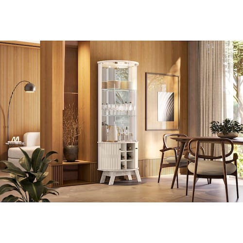 Cristaleira Marina, um produto ideal para ambientes compactos! Sua largura é de 67cm, e altura 1,80m. Ela é a combinação perfeita de sofisticação e funcionalidade, a prova disso são as suas características. Possui luminária de LED, que traz um charme e iluminação ao ambiente. Conta com duas prateleiras de vidro 6mm, e suas laterais e portas também são de vidro 5mm. Essa combinação de LUZ, Vidros e espelhos criam um efeito fantástico no produto. Ainda falando dos detalhes, essa cristaleira possui adega, puxadores de bronze e pés “palito”. Outro diferencial incrível são as portas deslizantes e flexíveis que acompanham a curvatura do produto. Um detalhe nunca visto no mercado brasileiro de móveis. Confira as cores disponíveis e traga inovação e sofisticação ao seu lar.