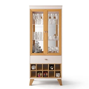 A Cristaleira Adega Sala de Jantar Yves Off White/Cinamomo é uma excelente escolha para quem deseja exibir seus itens de forma sofisticada e segura. Ela possui 2 portas de vidro emolduradas em MDF, 2 prateleiras de vidro, fundo com espelho, e também moldura superior e pés de madeira levemente angulados realçando o estilo retrô do móvel. Contém também nicho adega adicionando ainda mais funcionalidade à cristaleira, permitindo que você organize e exiba suas bebidas favoritas de forma prática e elegante. O fundo de espelho não só amplia visualmente o ambiente, criando uma sensação de maior espaço, como também realça a beleza dos objetos expostos. O vidro permite que seus objetos de decoração, louças e taças deixem visíveis de maneira elegante. Os puxadores em poliestireno com acabamento metálico fosco são uma excelente escolha para o design da cristaleira. Esse móvel não é só funcional, como também traz um charme único, elevando a decoração e transformando qualquer espaço com seu estilo refinado. Não perca a chance de garantir a sua!
