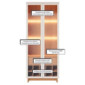A Cristaleira Guanabara fabricado pela Colibri, com um design cuidadosamente elaborado oferece estilo e praticidade, desenvolvida para armazenar utensílios de louças sendo uma ótima escolha para deixar seu ambiente muito mais organizado e elegante. Possui uma gaveta espaçosa com corrediças telescópicas que trazem mais suavidade ao abrir e fechar. Seu destaque fica nas portas em vidro com moldura estilo retro, e com puxadores metálicos dourados permitindo que todo conteúdo interno fique a vista. Duas prateleiras em vidro equipadas por fita led dando aquele toque aconchegante e sofisticado para seu uma adega com capacidade de acomodar até dez garrafas. Sua combinação de funcionalidade e praticidade sem abrir mão do estilo será a escolha ideal para deixar seu ambiente mais belo! Garanta já o seu!