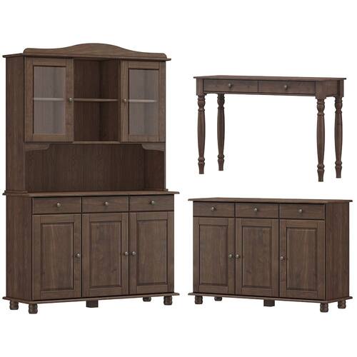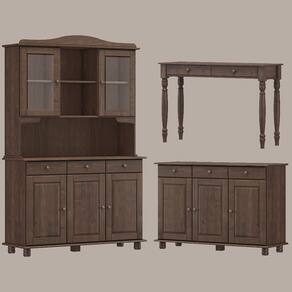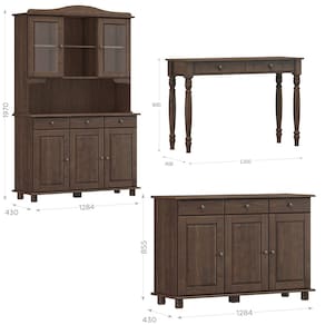 Cristaleira, Balcão Buffet e Aparador, um conjunto projetado para quem busca móveis que combinam elegância e funcionalidade para complementar sua decoração. Produzido em madeira maciça de pinus de reflorestamento, sua estrutura robusta garante durabilidade e resistência. A Cristaleira conta com 05 portas, sendo 02 de vidro incolor e 01 gaveta, o Balcão com 03 portas e 03 gavetas, e o Aparador com 02 gavetas. As portas possuem dobradiças com amortecimento, e as gavetas corrediças telescópicas, que proporcionam abertura suave e silenciosa. Com pintura acetinada com verniz PU e UV, que realça a beleza natural da madeira enquanto protege contra desgastes do dia a dia, e puxadores metálicos que adicionam um toque moderno ao design clássico do produto. Os pés torneados em madeira maciça garantem estabilidade e charme artesanal. Oferecem amplo espaço interno, perfeitos para organizar louças, objetos decorativos ou itens de sua preferência. Estes móveis chegarão em sua casa separados em 04 volumes.