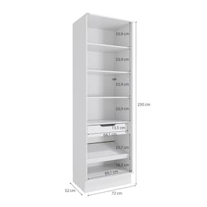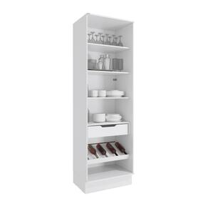 Acabamento: Pintura Brilho / Pintura Touch | Acabamento da Fita Borda: Papel | Cor: Branco/Nogueira | Corrediças: Telescópicas | Dobradiça: Com Amortecimento | Garantia: 3 meses para defeito de fabricação | Matéria-prima: MDF / MDF/ Vidro | Peso suportado por cada gaveta: 6 Kg | Peso suportado por cada prateleira: 7 kg | Puxadores: Metálicos | Quantidade de gavetas: 1 | Quantidade de portas: 2 | Quantidade de prateleiras: 5 | Sistema de montagem: Parafuso Philips | Tipo de porta: Bater