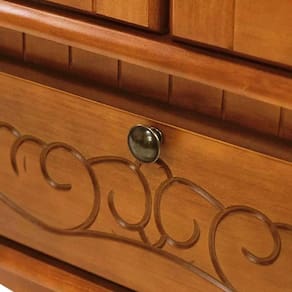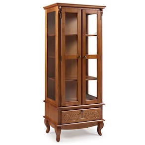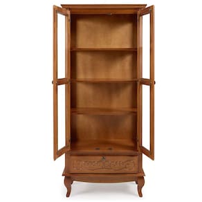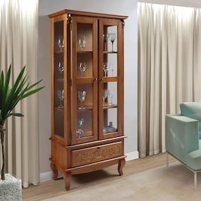O diferencial desta cristaleira rústica são suas portas e laterais em vidro, que permitem uma visão clara do conteúdo interno que terão espaço de sobra graças as suas três prateleiras, a parte frontal da gaveta apresenta um desenho entalhado na madeira, adicionando um toque de elegância que é complementada por seus fascinantes Pés Luiz XV.