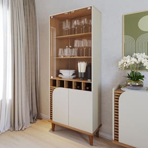 Explore a sofisticação da Cristaleira Jurerê, com um design caracterizado por pés de madeira maciça e linhas orgânicas. Suas duas portas são de vidro temperado. Possui adega para 5 garrafas, enquanto os apliques ripados e quinas arredondadas na base proporcionam um toque único. Os puxadores dourados completam a fusão perfeita entre o retrô e o contemporâneo. Transforme seu ambiente com esta peça que combina funcionalidade e estilo em cada detalhe. CARACTERÍSTICAS TÉCNICAS: - Produzido em MDP de 12 e 15mm, MDF de 15mm e HDF3 mm - Acabamento Fosco com Pintura UV - Portas com Dobradiça Metálica - Portas com Vidro Temperado de 5mm - Detalhe Curvo e Ripado Artesanal - Adega para 5 Garrafas - Pés em Madeira Maciça com 17,5 cm de Altura - Peso Suportado na Base de 8kg - Peso Suportado por Prateleira de 5kg - Possui 4 Portas, sendo 2 de vidro e 2 Prateleiras INFORMAÇÕES TÉCNICAS: Altura: 182,2cm Largura: 70cm Profundidade: 39,3cm Peso: 44kg ITENS INCLUSO: - Cristaleira Jurerê - Manual de Montagem - Kit de Ferragens INFORMAÇÕES ADICIONAIS: - Não realizamos a montagem do móvel e não nos responsabilizamos por ela. Verifique o produto antes de montá-lo. Produtos danificados na montagem não serão trocados. Montagem e instalação são por conta do comprador. - As imagens decorativas são ilustrativas e podem conter itens não inclusos. As cores do produto podem variar conforme o monitor, iluminação ou percepção visual. - Limpeza: Use um pano macio e seco ou levemente umedecido com água. Não utilize materiais abrasivos como palha de aço ou objetos cortantes. Garantia de 3 meses contra defeitos de fabricação conforme o Código de Defesa do Consumidor.