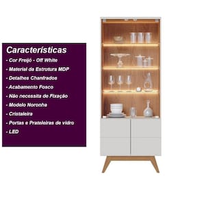 A Cristaleira Noronha fabricado pela Colibri, apresenta ótimo espaço interno de armazenagem duas portas em MDP/MDF, materiais que garantem resistência . Duas portas e também duas prateleiras espaçosas em vidro temperado proporcionando amplo espaço para exibir seus utensílios de porcelana, cristais e taças para dar aquele toque sofisticado e puxadores em alumínio dourado. Acompanha luminárias de fita led adicionando uma iluminação suave deixando seu ambiente aconchegante e realçando a beleza dos seus itens que ficaram visíveis pela porta de vidro. Possui quatro pés de madeira maciça. Seu design moderno e funcional adiciona um charme natural e elegante ao seu ambiente!