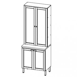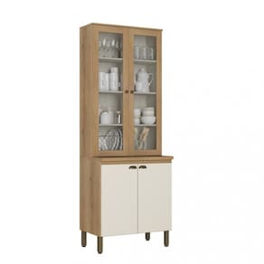 Características: Estrutura e portas em MDP de 15mm Fundos do módulo em MDF de 3mm 4 Portas sendo 2 com vidros 1 Prateleira removível 4 Tampos fixos, 1 tampo de 30mm 4 Pés reguláveis, 2 puxadores ponto 2 puxadores ponto, 2 Puxadores concha Dobradiças metálicas com amortecimento Sistema de montagem com parafusos e cavilhas