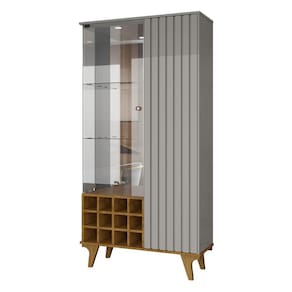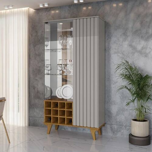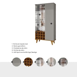 - Produzida em MDP 15/25mm: maior durabilidade e resistência. - Acabamento em pintura UV. - 1 porta ripada (24mm) com prateleiras internas (suportam até 5kg em cada). - 1 porta em vidro (4mm): amplo espaço para exibir e acomodar todas as suas louças. - 2 prateleiras em vidro (4mm): suportam até 2kg em cada. - Kit de luminárias LED com botão liga/desliga. - Espelhos em vidro (3mm): ampliam o ambiente. - Pés em madeira de pinus no estilo retrô: maior estabilidade ao móvel. - Adega para colocação de garrafas: maior organização.
