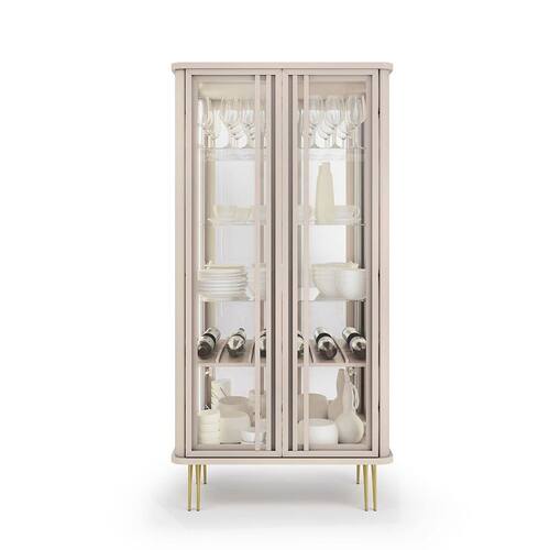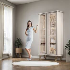 Os pés de aço maciço com acabamento dourado adicionam um toque de requinte, proporcionando estabilidade e sofisticação. Disponível em Off White, Off White-Cinamomo e Verde Pistache, a Cristaleira Crystal se adapta a diversos estilos de decoração.