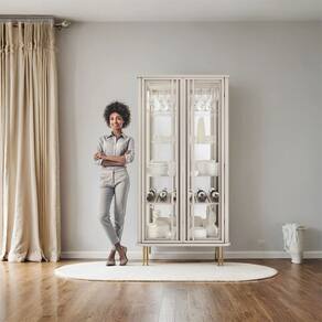 Produzida em MDF de 25mm e 15mm, a Cristaleira Crystal se destaca pelo seu design contemporâneo que mescla elementos industriais e orgânicos. As portas de vidro emolduradas, com cantos arredondados e abertura fecho toque, garantem elegância e praticidade no dia a dia.