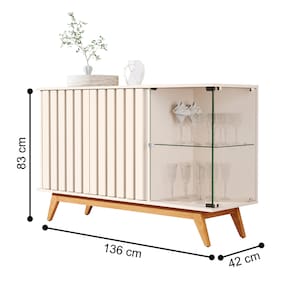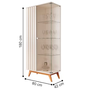 A cristaleira é feita em MDP 24mm. Contém 1 porta com detalhes ripados e 1 de vidro e 3 prateleiras.