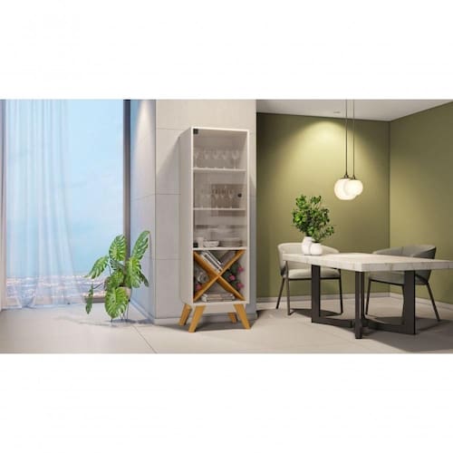 Com estilo retrô a Cristaleira Graça é o complemento ideal para organizar e deixar sua sala de jantar mais aconchegante. Produzida em MDP 15mm, Porta em vidro temperado, Adega decorativa, Pés em madeira maciça.