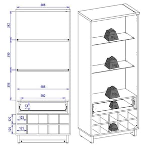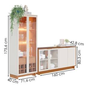 Cristaleira Guanabara e Balcão Buffet Vitoria, design minimalista e funcional para transformar sua sala de jantar. Estrutura em MDP/MDF (25/15 mm) e acabamento em pintura UV texturizada. Possui portas em vidro (5 mm) com molduras em MDF e puxadores em alumínio (dourado), fitas LED, adega interna para 10 garrafas, gaveta com corrediças telescópicas e prateleiras internas (Cristaleira em Vidro 5mm e Balcão com prateleiras reforçadas). Estes produtos serão entregues em 5 volumes.