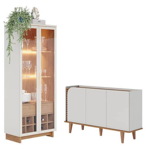 Apresentamos este conjunto de Cristaleira Guanabara e Aparador Buffet Jurerê, fabricados pela Colibri. A cristaleira possui uma gaveta espaçosa com corrediças telescópicas que trazem mais suavidade ao abrir e fechar. Seu destaque fica nas portas em vidro com moldura estilo retrô, e com puxadores metálicos dourados permitindo que todo conteúdo interno fique à vista, duas prateleiras em vidro equipadas por fita led dando aquele toque sofisticado para seu ambiente e uma adega com capacidade de acomodar até dez garrafas. O aparador possui duas portas, duas prateleiras internas reforçadas, três portas giro equipadas dobradiças metálicas. Seu detalhe destaca-se pelos aplique ripados nas portas realçando elegância e seu tampo amadeirado recuado proporciona sensação de uma bandeja, uma ótima opção para exibir seus objetos ou até mesmo servir refeições. Fabricados com materiais de alta qualidade que garante resistência e durabilidade aos produtos. Confira mais detalhes e aproveite!