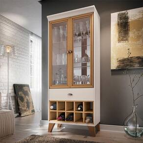Cristaleira Intense Cinamomo/off White - Pr Móveis Cinamomo/off White Cristaleira Intense - PR Móveis A Cristaleira, tem um design retrô ideal para compor a decoração de salas de jantar ou estar. Portas e prateleiras em vidro e fundo com espelho dando um toque inovador ao produto, deixando o ambiente mais elegante e valorizando ainda mais a decoração. ESPECIFICAÇÕES: - Produto em MDP e MDF de 25mm e 15mm - Pintura UV - 2 Prateleiras de vidro 6mm com suportes cromados - Espelho atrás da prateleira de vidro de 3 mm - 2 Portas de vidro emolduradas em MDF revestidas com papel melamínico - Puxador com acabamento metálico na cor bronze - Moldura superior robusta valorizando e realçando os aspectos retrô do móvel - Pés de madeira maciça levemente angulados com acabamento envernizado - Adega central para 10 garrafas