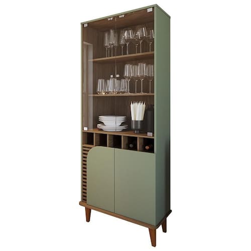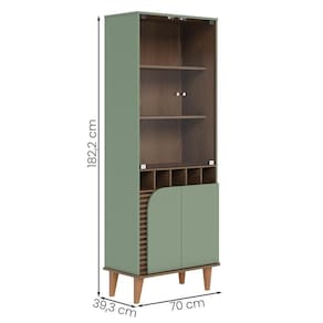 Descubra a sofisticação da Cristaleira Jurerê, com design marcado por pés de madeira maciça e linhas orgânicas. Suas duas portas de vidro temperado (5mm) revelam uma adega para 05 garrafas, enquanto apliques ripados e quinas arredondadas na base conferem um toque único. Os puxadores dourados completam a fusão perfeita entre o retrô e o contemporâneo. Transforme seu espaço com esta peça que une funcionalidade e estilo em cada detalhe.