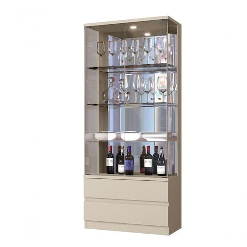 Tampo maciço de 25 mm, luminária LED bivolt, cantoneira para fixar o tampo na parede, prateleira de vidro temperado, puxador em alumínio bronze, espelho para dar amplitude ao ambiente, lateral de vidro temperado, porta de vidro tempero, base maciça de 25 mm, gavetas com corrediças telescópicas. Altura: 184 cm Largura: 71 cm Profundidade: 36 cm