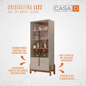 A Cristaleira Lizz veio para completar qualquer ambiente. Este tradicional móvel é perfeito para expor suas louças e permite total visualização dos mesmos em seu interior a partir de suas duas portas de abrir em vidro. A Cristaleira Lizz conta ainda com quatro prateleiras em MDP com espessura de 15mm. Seus pés em estilo retro são um charme e traz um design moderno a qualquer cômodo.