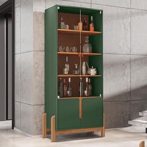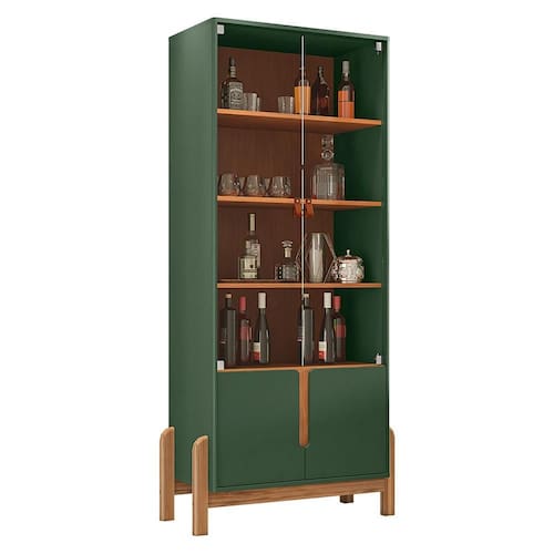 ESPECIFICAÇÕES: Estrutura em MDP e MDF Pintura UV 2 Portas de MDF usinadas com detalhe curvo 2 Portas de vidro temperado de 4mm Dobradiças soft-close Interna com prateleiras em MDP com espessura de 15mm Puxadores de alça de couro ecológico Base e laterais de MDF com cantos arredondados Tampo, prateleira e batente MDP 15mm Pés de madeira maciça