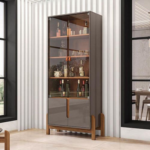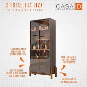 Marca: Casa D; Linha: Sala; Modelo: Cristaleira Lizz; Material da estrutura: MDF de 15 mm e MDP 15 mm com pés de madeira maciça e vidro temperado de 15 mm; Acabamento: Pintura Print Wood; Altura: 179,5 cm; Largura: 85 cm; Profundidade: 36 cm; Quantidade de portas: 04, inferiores com sistema Soft-Close (fechamento macio); Material de dobradiças: Metálicas (Soft-Close); Quantidade de gavetas: Não se aplica; Com corrediças: Não se aplica; Material das corrediças: Não se aplica; Com puxador: Sim, detalhe curvo; Material do puxador: Embutido; Quantidade prateleiras: 04; Com rodízios: Não se aplica; Condição do item: Novo; É kit: Não; Peso suportado: 40 kg; Requer montagem: Sim (kit montagem incluso); Altura da embalagem: 14,3 cm; Largura da embalagem: 43,2 cm; Comprimento da embalagem: 166 cm; Peso: 42,4 kg; Embalagem do envio: Papelão e plástico. Informações adicionais: - Os objetos que ambientam as fotos não acompanham o produto; - O produto será entregue desmontado; - É de inteira responsabilidade do cliente a montagem do produto e/ou instalação, custos de transporte por escadas e/ou elevadores, guincho ou içamento, assim como possíveis irregularidades provenientes de manuseio inadequado; - Embora o produto acompanhe o manual de montagem, verifique a complexidade antes de decidir montá-lo sozinho, recomendamos que contrate um profissional de sua confiança; - Fique atento, nossas cores podem sofrer alterações dependendo do seu monitor; - ANTES DE MONTAR O SEU PRODUTO, certifique-se que todas as instruções dispostas no manual, bem como todas as ferragens descritas, estejam presentes dentro da embalagem. Verifique se há alguma peça danificada, caso esteja, prestaremos a devida assistência dentro do prazo da garantia.